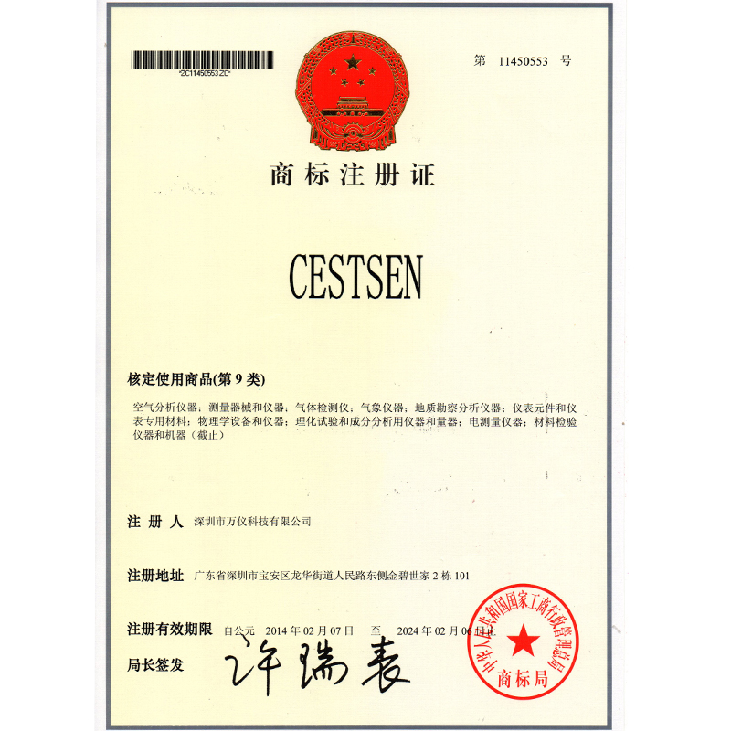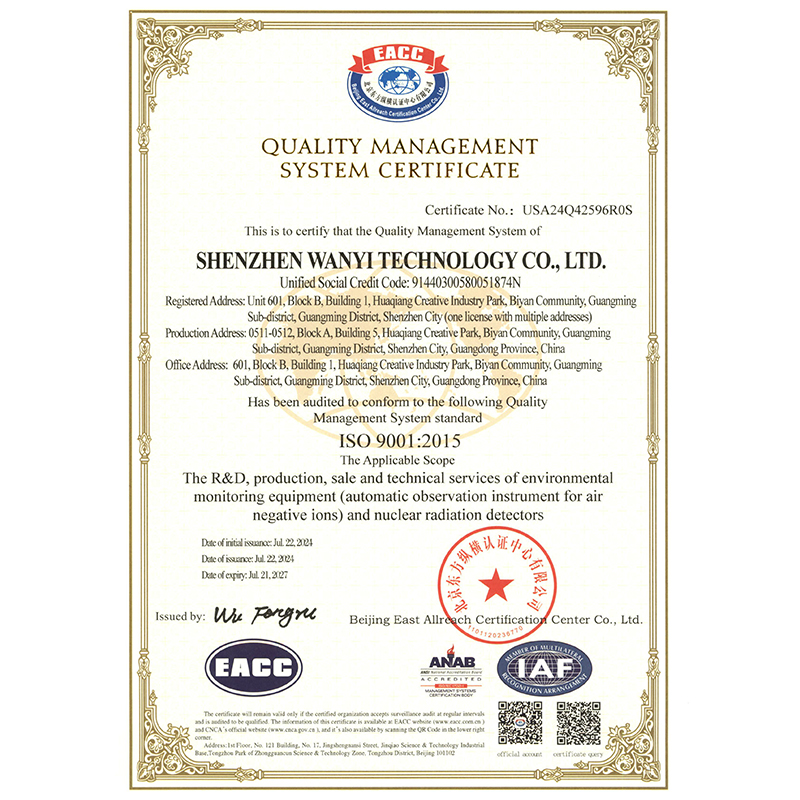 Shenzhen Wanyi Technology Co., Ltd. has passed ISO9001 quality management system certification, ISO9001 environmental management system certification, products have passed CMA and CE, ERP, measurement and other certification; and drafted the "negative ion detector" enterprise standard. For detailed qualification certificate, please contact us